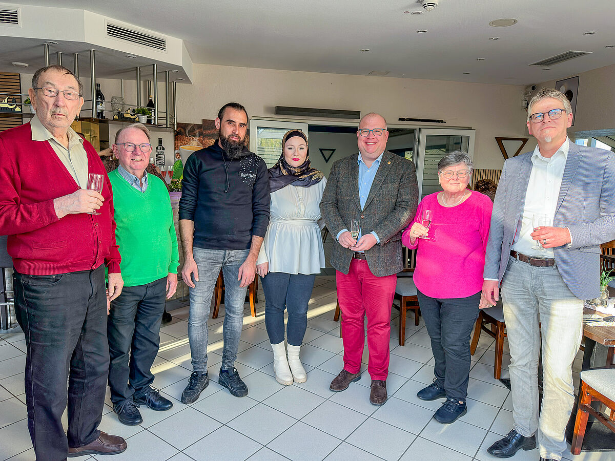 BU 1: Belal und Anna Al Ahmad stoßen gemeinsam mit Bürgermeister Stephan Paule und Bäder-Geschäftsführer Ralf Kaufmann sowie Vertretern der Kommunalpolitik auf die Eröffnung ihres Bistros am Erlenteich an.
