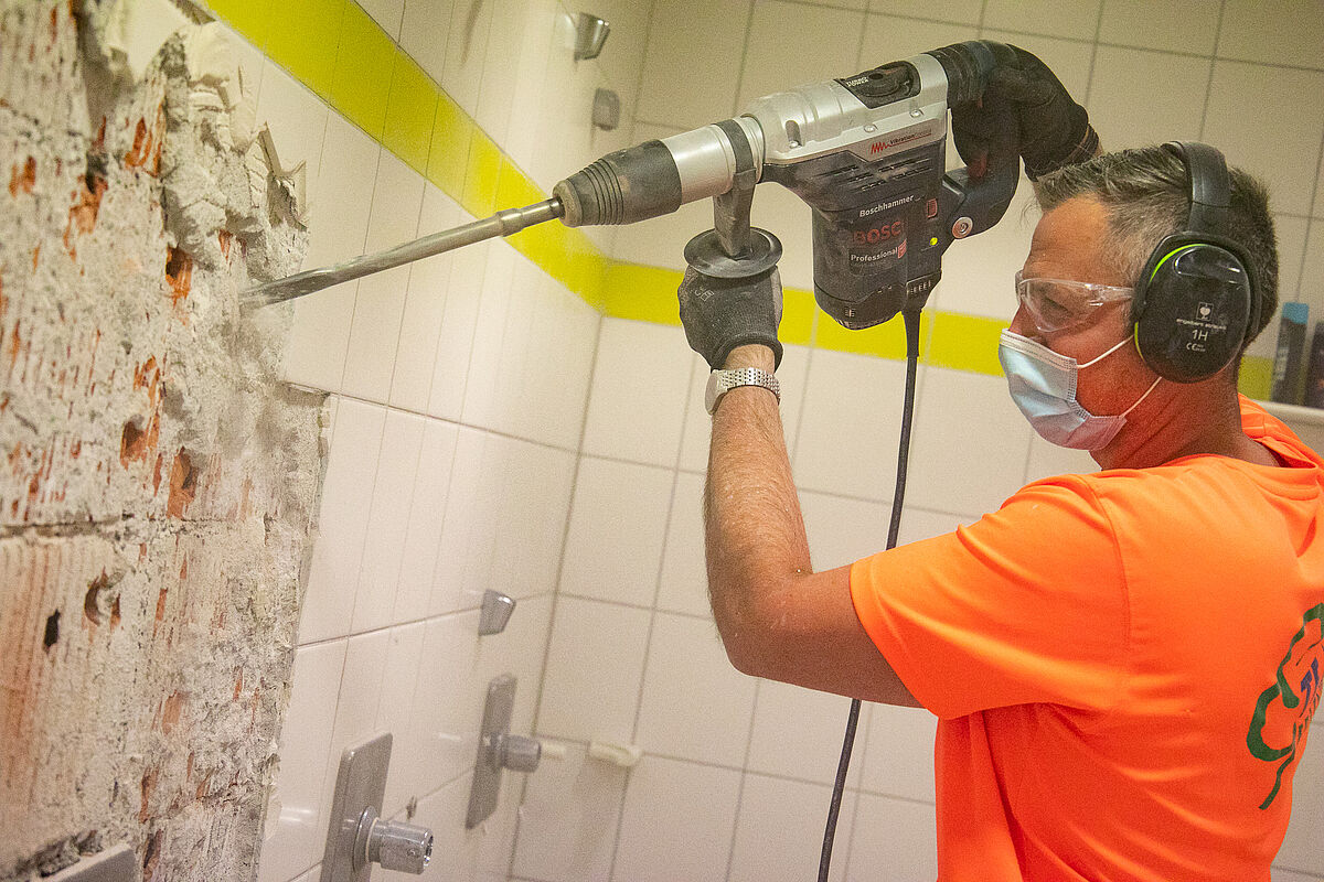 ALSFELD (kiri). Es war eine staubige Angelegenheit: Die Umkleidekabinen, Trennwände, Bänke, Spinde, Ablagen und Spiegel im Inneren des Alsfelder Erlenbads wurden abgerissen und fanden ihren Weg in einen großen Container. Zeit für Veränderung. Vorgezogene Zeit. „Eigentlich war die Modernisierung der Umkleidekabinen im Hallenbad erst für kommendes Jahr geplant“, erläutert Bäder-Geschäftsführer Ralf Kaufmann. „Aber wir nutzen die Zeit der Bauverzögerung bei der Hallenbaddecke und ziehen die Neugestaltung der Umkleideräume und Duschen vor.“