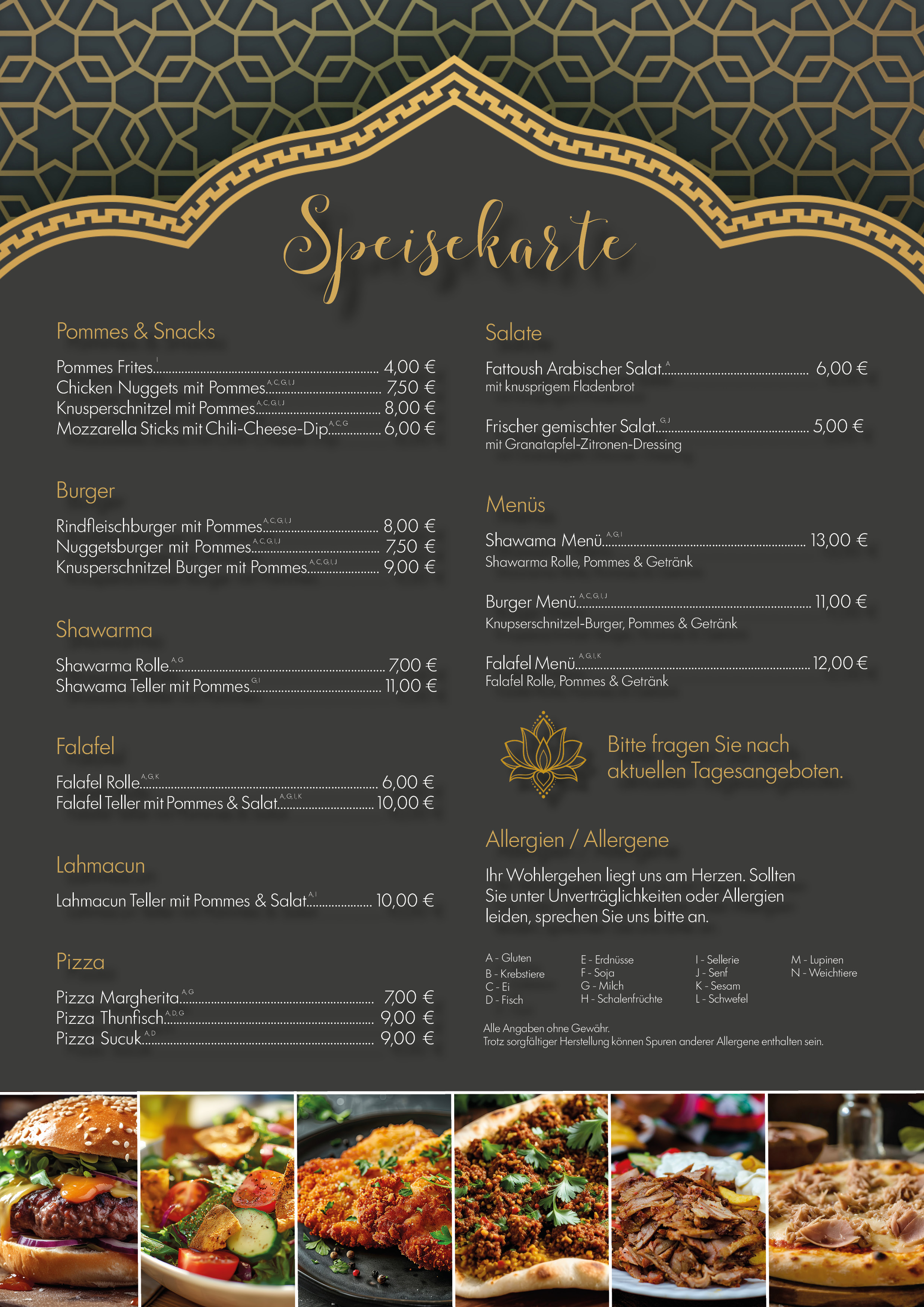 Freut euch auf eine abwechslungsreiche Mischung aus deutsch-amerikanischen Klassikern und syrischen Spezialitäten. Ob Schnitzel, Burger, Pizza, Nuggets oder frisch zubereitete Falafel – hier ist für jeden Geschmack etwas dabei.