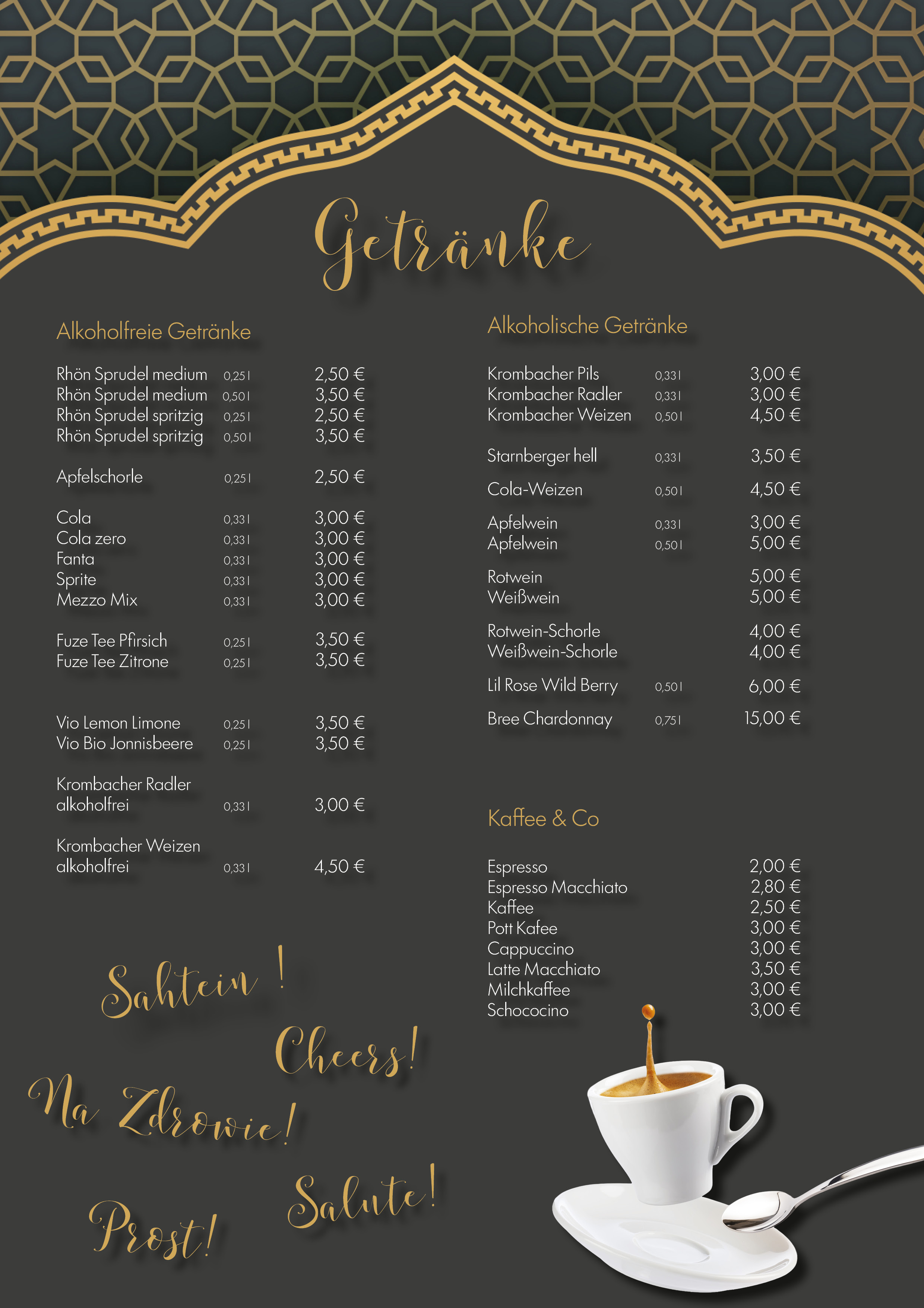 Hier können Sie unsere Speisekarte herunter laden. Hier bekommen Sie einen Einblick auf unsere Getränkekarte.